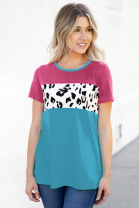 • 商品名称: 玫红色短袖圆领动物斑纹时尚拼色女士T恤上衣