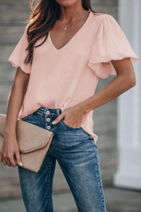 • 商品名称: 粉色V领泡泡袖宽松休闲女式上衣