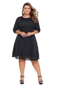 Black 3/4 Length Sleeve Gauze Patchwork Flare Plus Size Dress