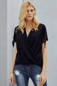 •The front wraps on this blouse that has a rolled hemline and tie sleeves